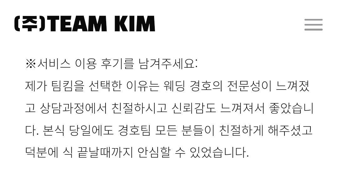 2. 전문 경호팀 제공: (주)팀킴은 저가 인력, 아르바이트, 대학생 등 비전문 인력을 고용하지 않으며, 예식 전담팀 구성으로 서비스 품질을 보장하는 업무만 담당합니다.